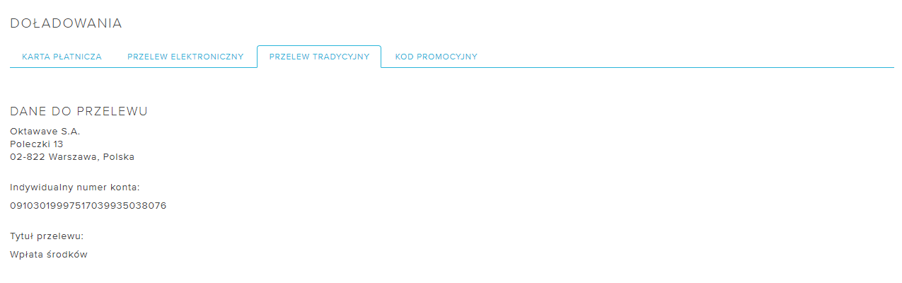 Przelew tradycyjny należy wykonać samodzielnie. Numer konta i dane będą widoczne w Doładowania > Przelew tradycyjny. Dla każdego naszego Klienta jest wygenerowany indywidualny numer konta do wpłat, więc środki trafią na Twoje konto w Oktawave automatycznie po dostarczeniu informacji z banku do naszej platformy.